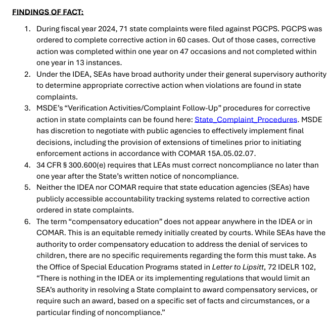 In a separate Letter of Findings, the Maryland State Department of Education determined that my child was denied a Free Appropriate Public Education (FAPE). I am sharing the relevant excerpt below in redacted form to maintain privacy while providing transparency.
